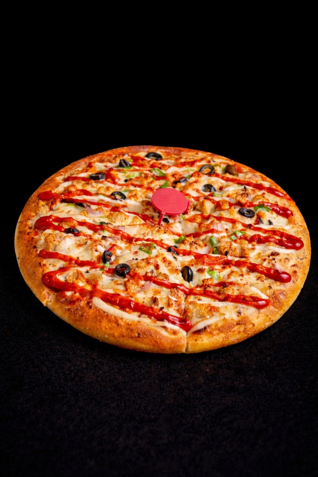 Buffalo hot pizza loaded with spicy buffalo chicken, fresh vegetables, rich tomato sauce, and melted mozzarella cheese on a crispy crust.