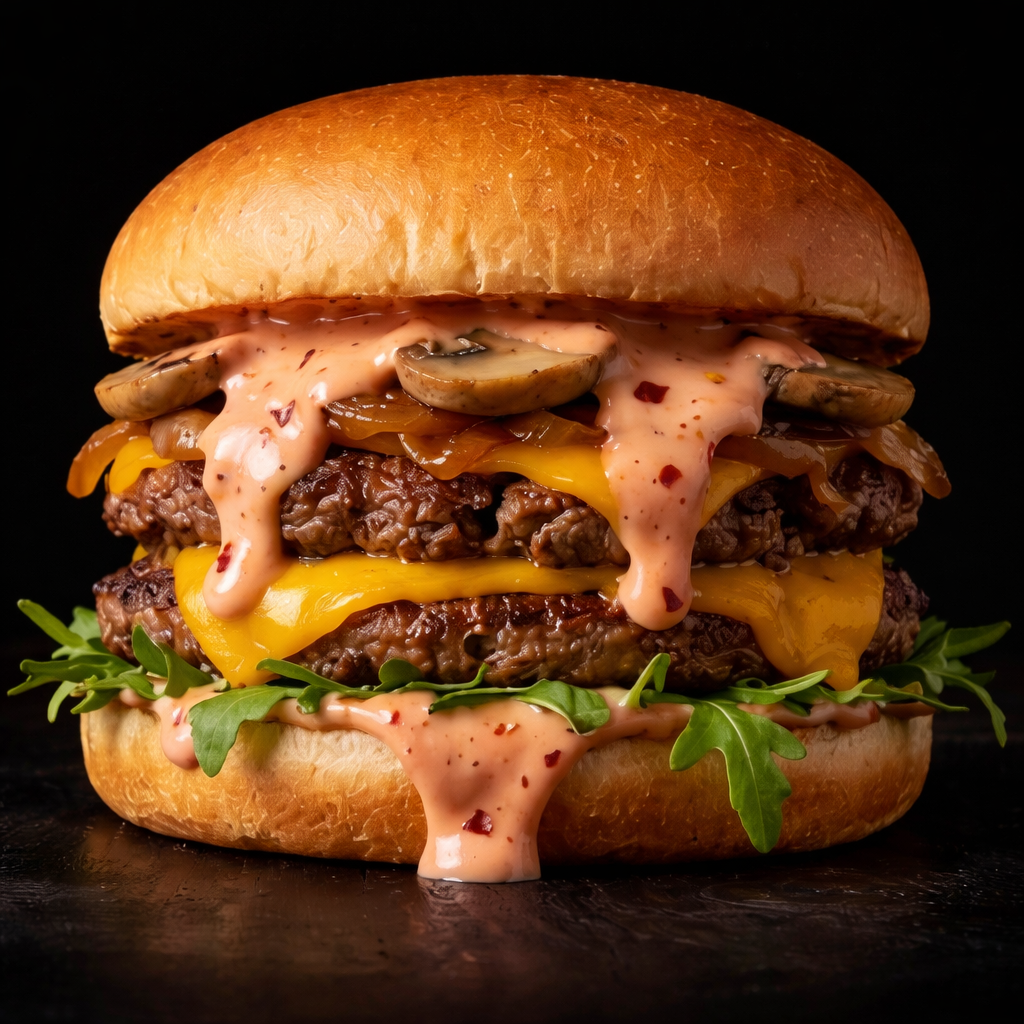 Two smashed beef patties glazed in garlic butter topped with extra cheese, fried jalapeños & sautéed mushrooms.