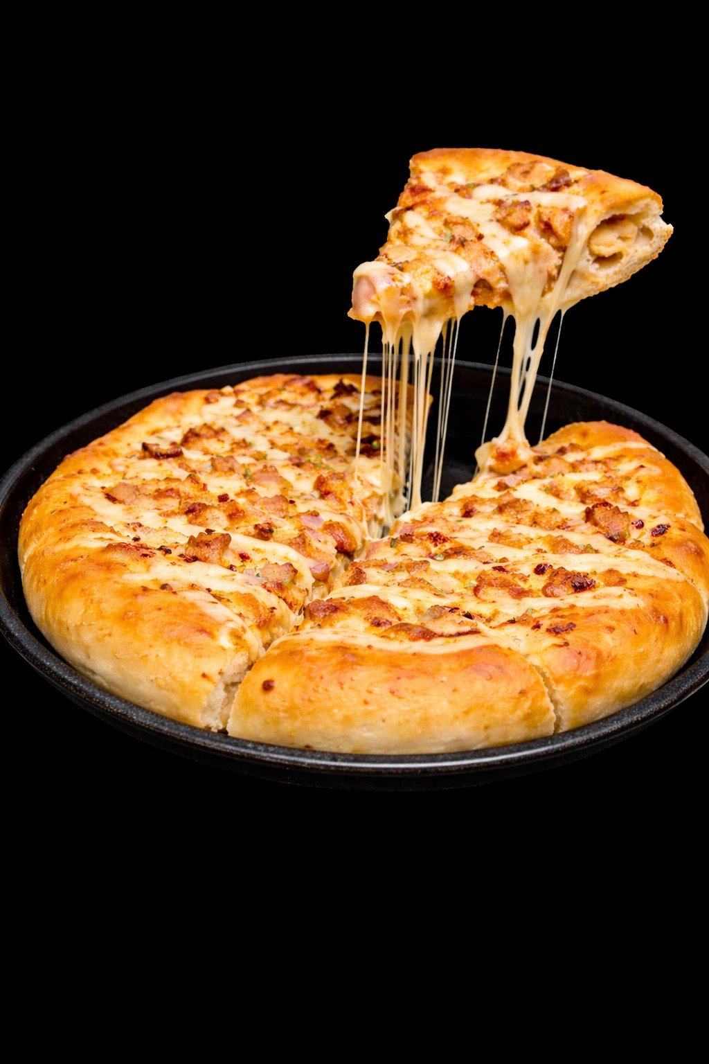 Juicy chicken tikka chunks with melted mozzarella cheese and rich pizza sauce baked on a fresh crust. A perfect smoky flavor pizza for chicken lovers.
