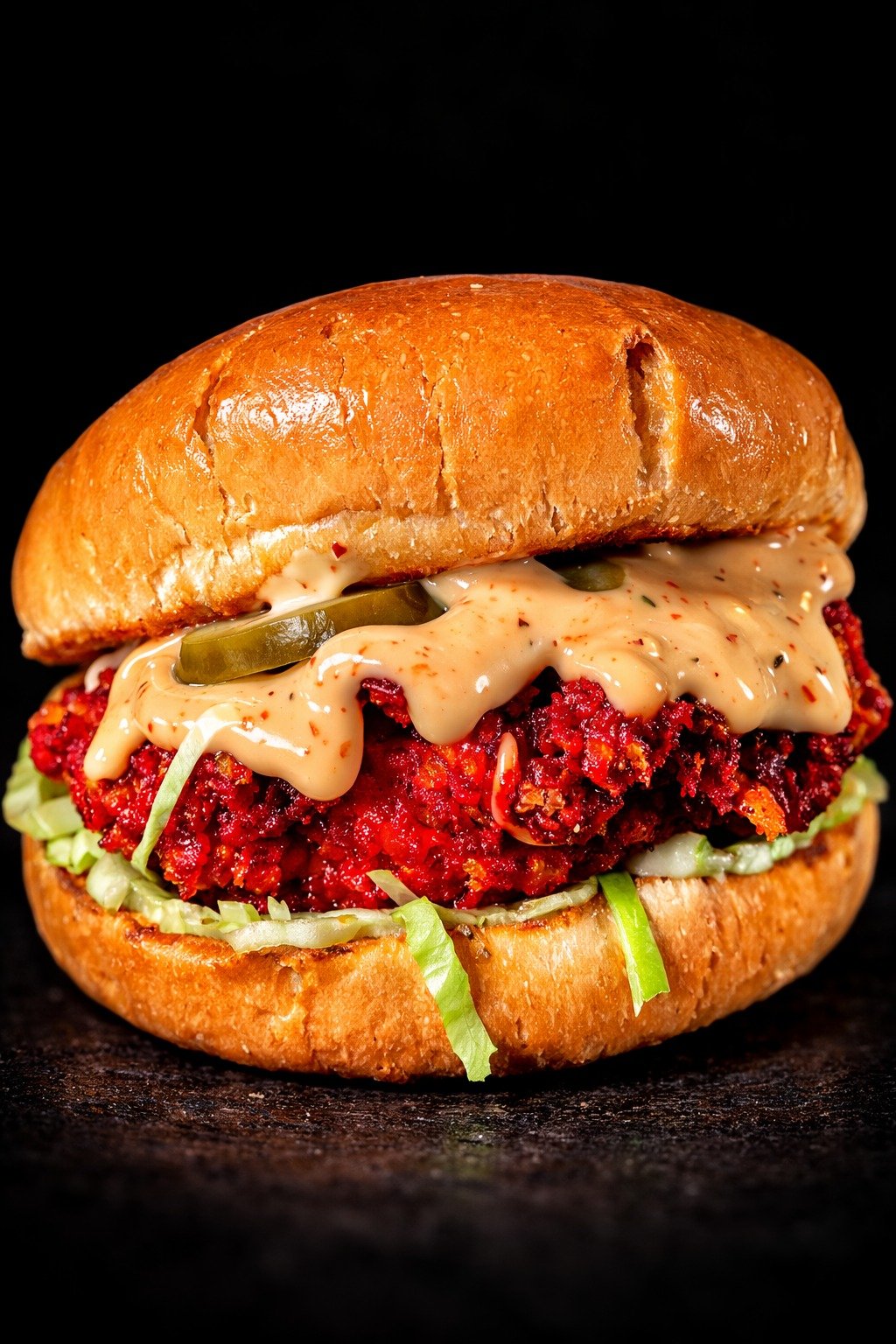 Crunchy buttermilk fried chicken coated in spicy crumbs, layered with jalapeños, iceberg, cheddar cheese & Fiery Garlic Sauce.